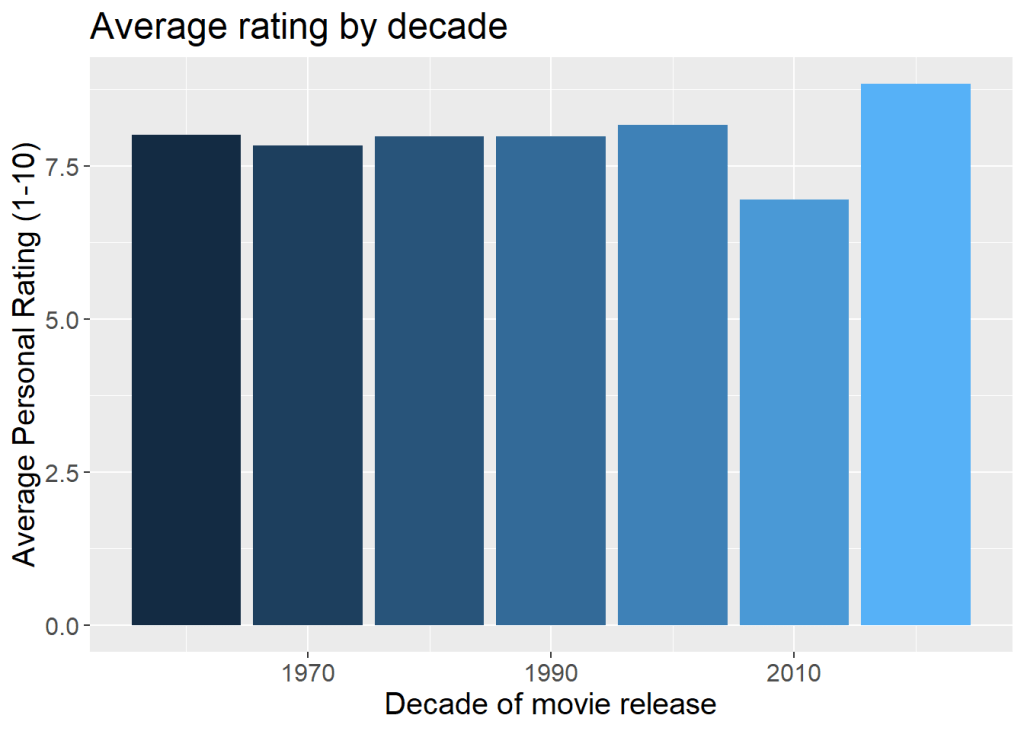labs(title="Average rating by decade", y = "Average Personal Rating (1-10)", x="Decade of movie release") + theme(text = element_text(size=15), legend.position = "none")