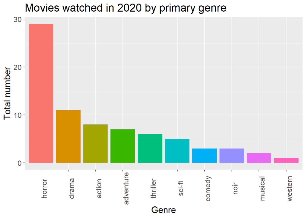 ggen + geom_col() + labs(title="Movies watched in 2020 by primary genre", x = "Genre", y = "Total number") +