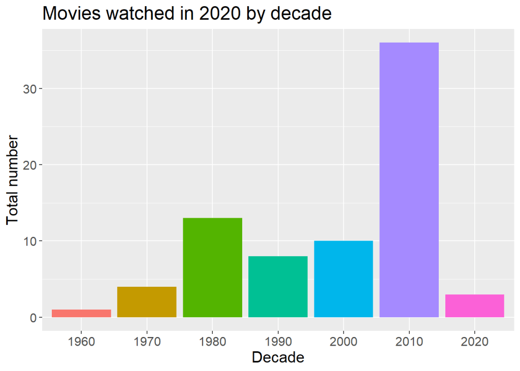 gdec + geom_col() + labs(title="Movies watched in 2020 by decade", x = "Decade", y = "Total number")