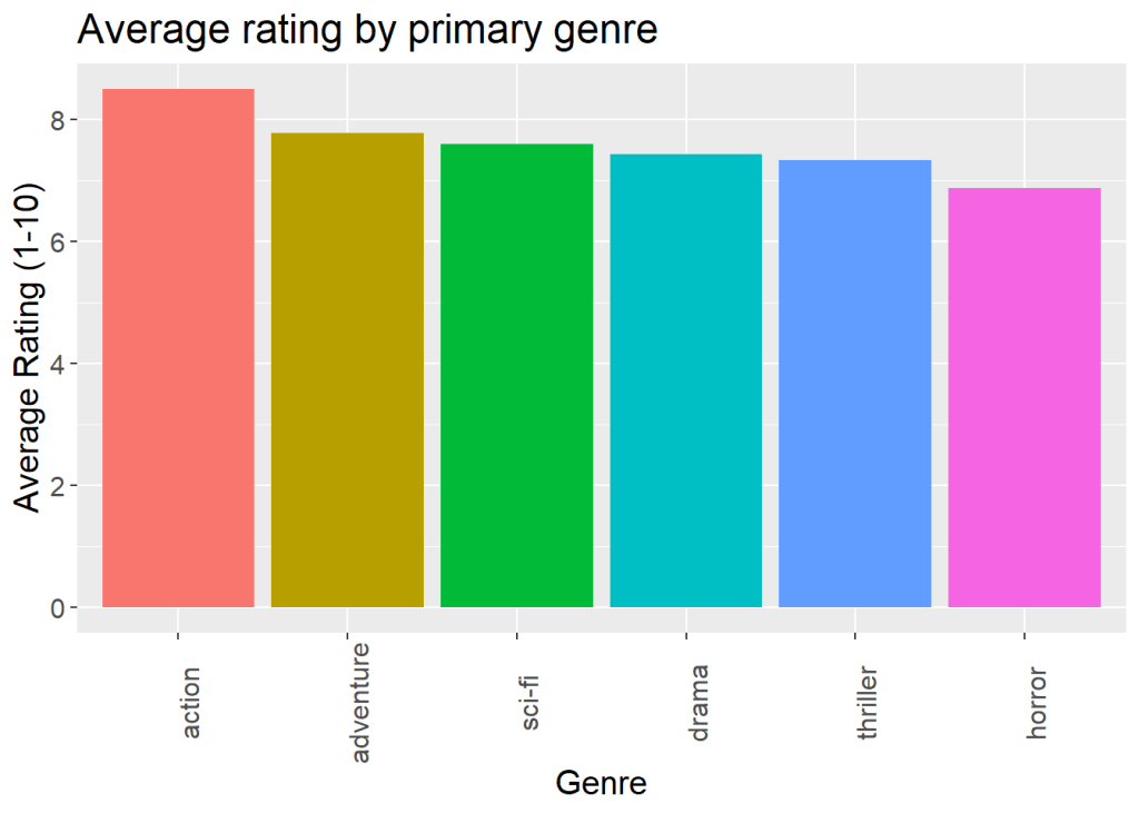 gavgg + geom_col() + labs(title="Average rating by primary genre", x = "Genre", y = "Average Rating (1-10)") + theme(text = element_text(size=15), axis.text.x = element_text(angle = 90), legend.position = "none")