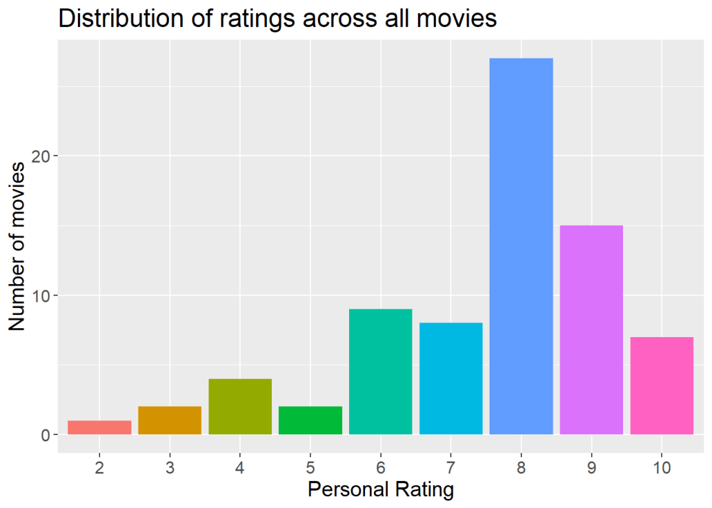 labs(title="Distribution of ratings across all movies", x = "Personal Rating", y = "Number of movies") +